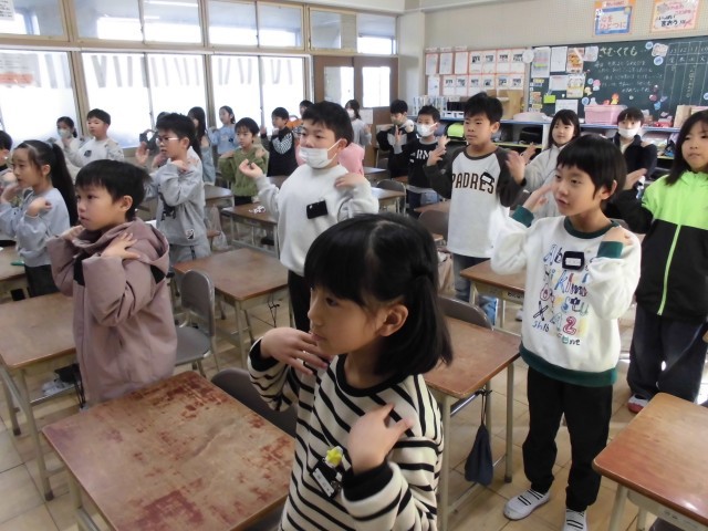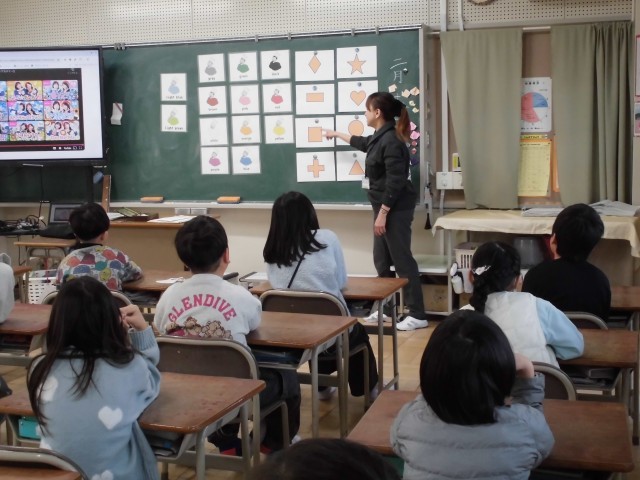今日は、子どもたちがとても楽しみにしている英語の授業がありました。1年間に習ったことのまとめで、図形や色を英語で言ったり、英語の数え歌「7Steps」を歌ったりしました。耳から聞いた英語を覚えるのがはやくて、感心しました。