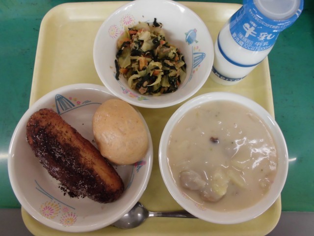 今日の献立は「ココア揚げパン・プチパン(5・6年生)・牛乳・ほうれんそうのソテー・ミートボールのホワイトシチュー」でした。
