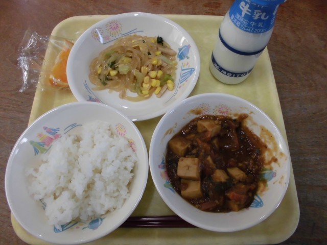 今日の献立は「ごはん・牛乳・ヘルシーマーボードウフ・バンサンスー・清見オレンジ」でした。