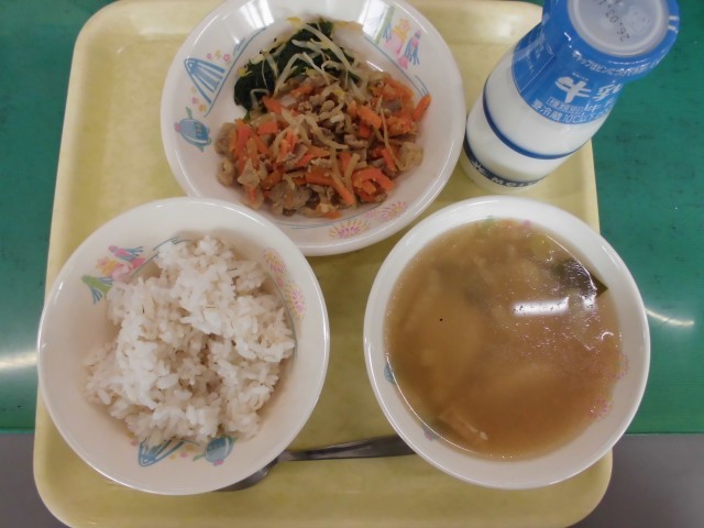 今日の献立は「麦ごはん・牛乳・ビビンバの具(肉)・ビビンバの具(野菜)・トックスープ」でした。