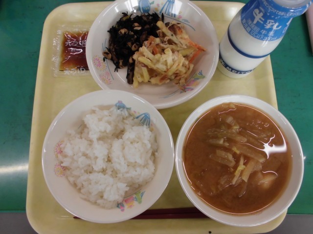 今日の献立は「ごはん・牛乳・手作りかき揚げ天丼(具)・大豆のいそ煮・さけ団子汁・天つゆ」でした。