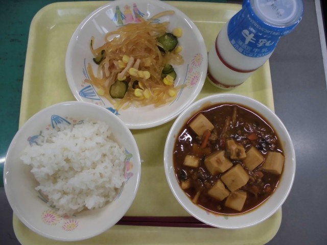 今日の献立は「ごはん・牛乳・バンサンスー・マーボードウフ」でした。