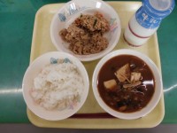 今日の給食は、ごはん 牛乳 ピリ辛汁 白身魚の黒酢あんかけ こがね和えです。