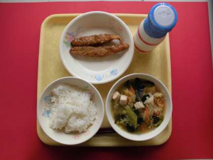 今日の給食は、ご飯・牛乳・けんちん汁・米粉のししゃもフライの香味だれ です。