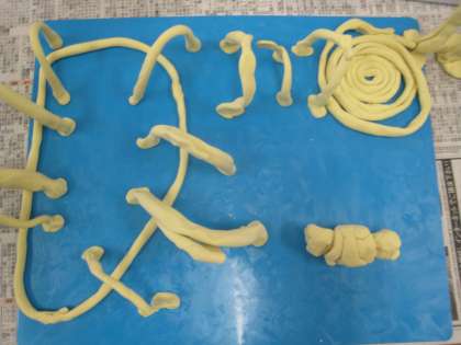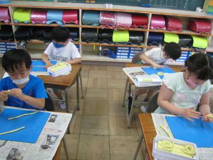 図工の時間には、粘土をひもにしながら思いついた形を表しました。つくりだす喜びを味わって、楽しく活動しました。
