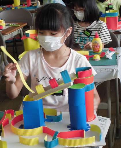 図工の授業でコロコロガーレを作っています。ビー玉がスタートからゴールまで転がるようにコースを工夫して作っています。どんな作品が出来上がるか楽しみです!