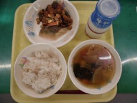 今日の給食は、栗菜飯 牛乳 すまし汁 とり肉とれんこんの揚げ煮 です。