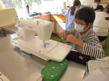今日の家庭科は、ミシンを使って作品を縫いました。角で曲がるのが難しいですが、みんな頑張っていました。