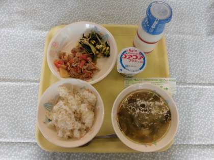 今日の献立は、「ビビンバ、牛乳、中華コーンスープ、ヨーグルト」でした。