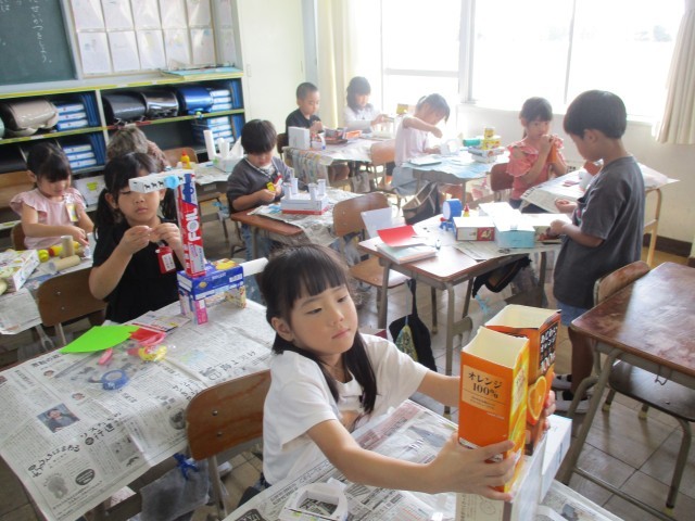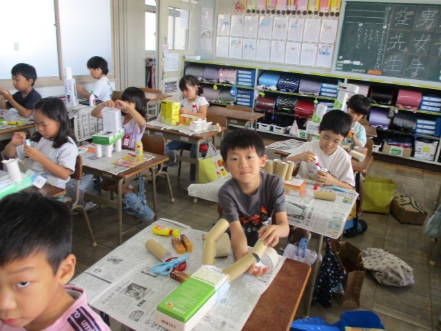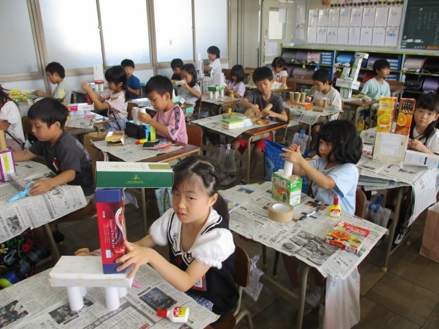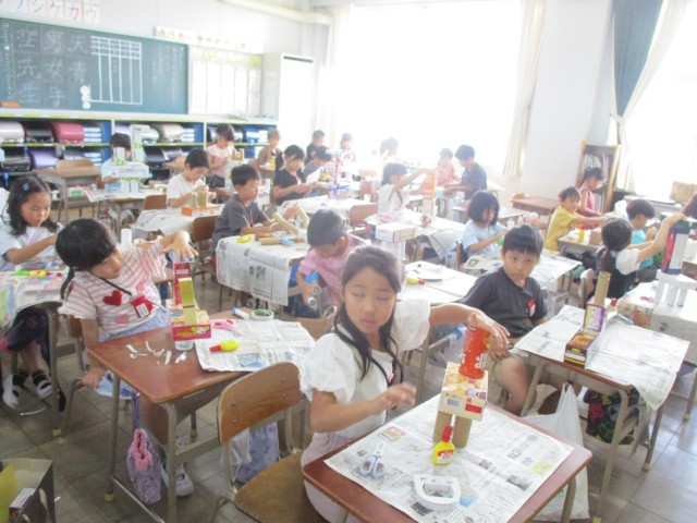 図工「はこでつくったよ」の学習で、箱を重ねたり組み合わせたりして、生き物や乗り物などを作りました。