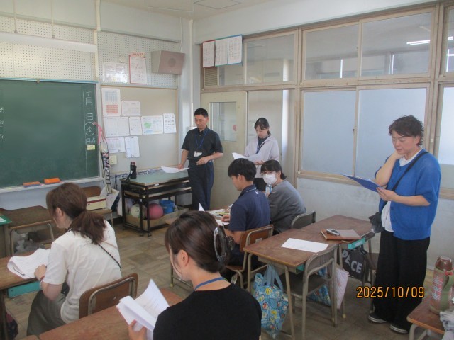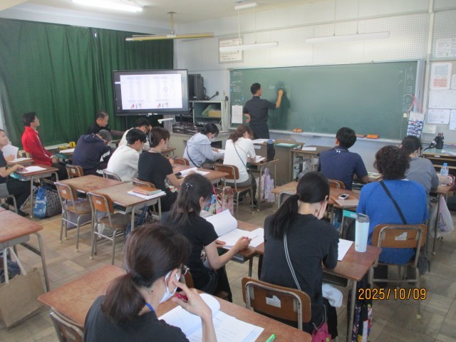 児童の下校後に、先生たちで集まり、授業の指導法について研修会を開きました。