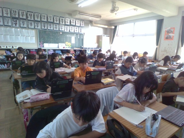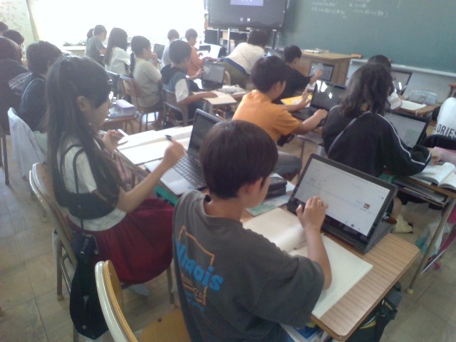 社会の授業の様子です。愛知県内に残る祭りについて調べ、まとめています。