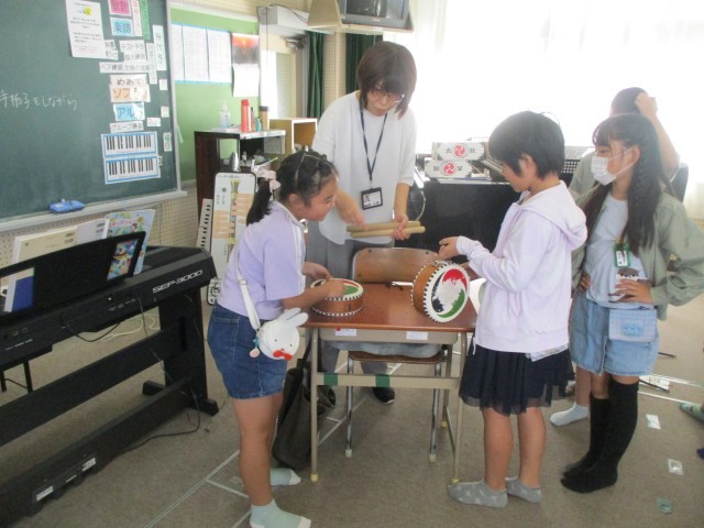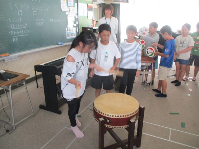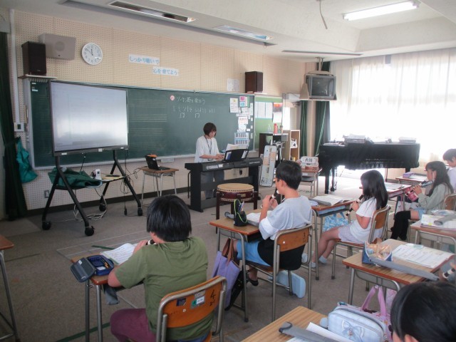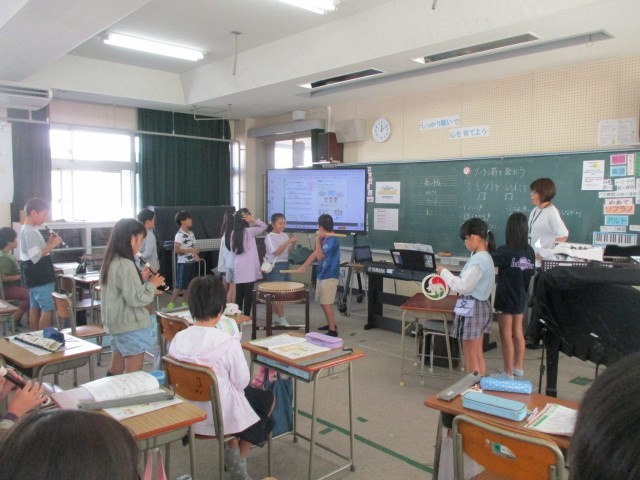 音楽の授業の様子です。太鼓・リコーダー・歌のパートにわかれて、ソーラン節を演奏しました。