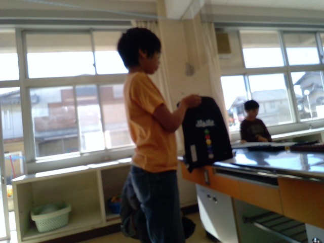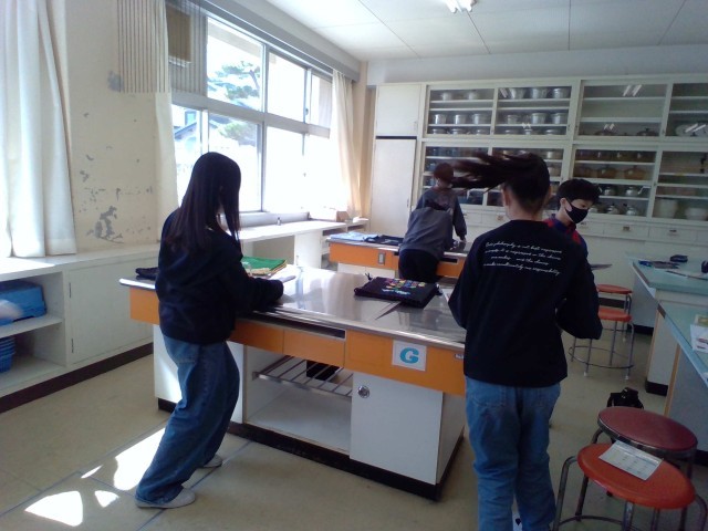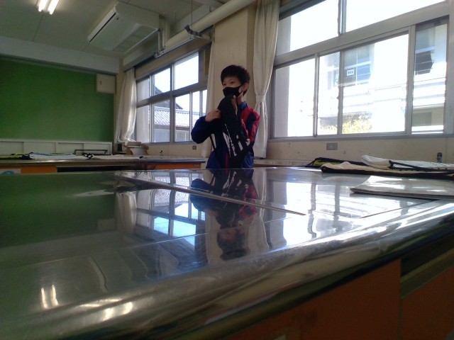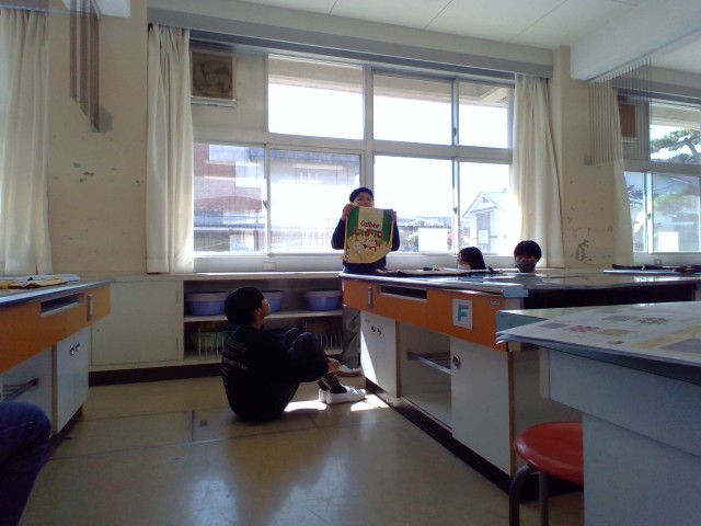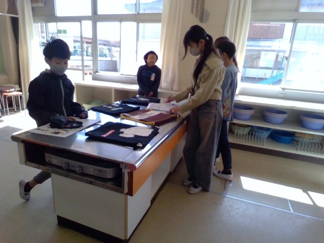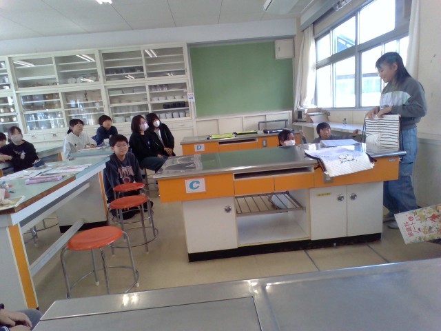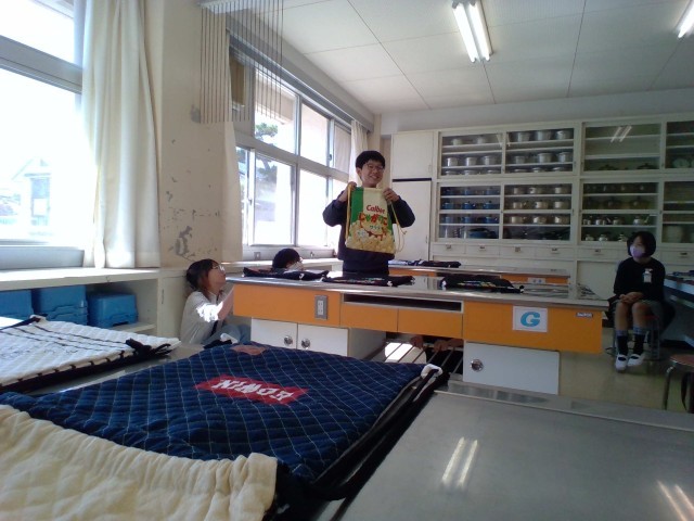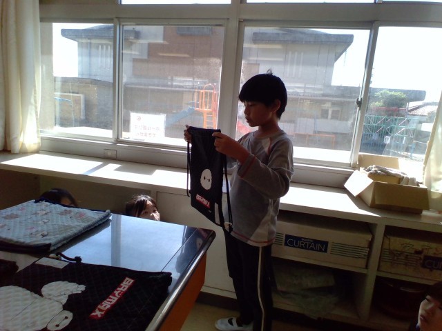 今日は家庭科の授業で「世界でひとつ ナップザック発表会」を行いました。