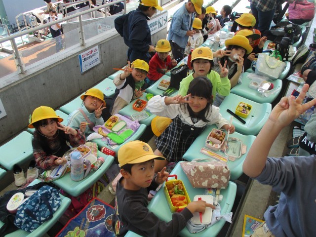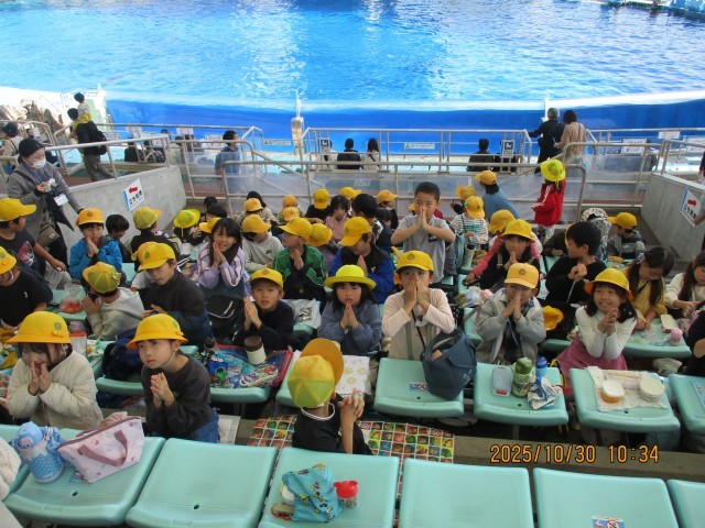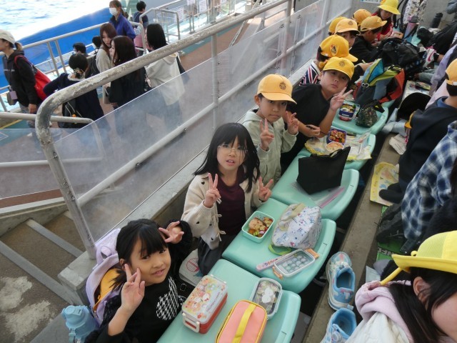 イルカショーのスタジアムでお弁当を食べました。お弁当などのいろいろな準備をしていただき、ありがとうございました。