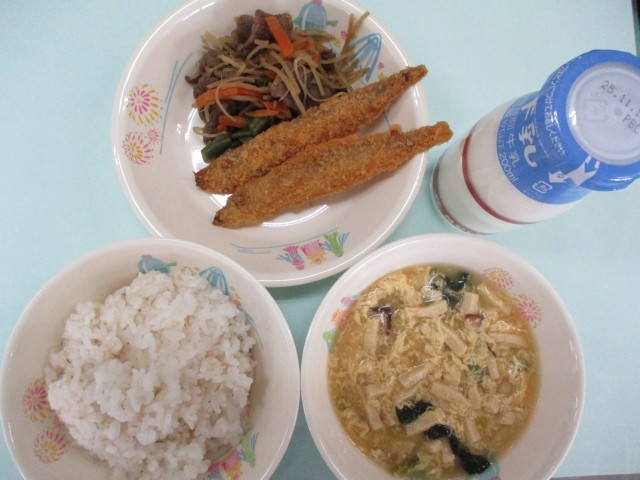 麦ご飯・牛乳・子持ちシシャモフライ・きんぴらごぼう・かきたま汁
