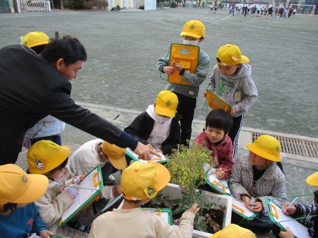 生活科の学習で芽キャベツとブロッコリーの観察をしました。よく見るだけでなく、さわったり匂いを嗅いだりとじっくりと観察することができました。「こんなところにできるの?」や「ブロッコリーの花って黄色なんだね!」と驚きの声が聞こえてきました。