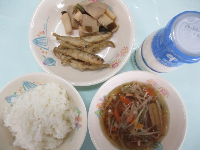ご飯・牛乳・わかさぎのから揚げ・里芋とイカのうま煮・沢煮わん