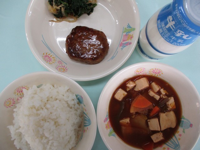 ご飯・牛乳・照り焼きハンバーグ・ごま和え・豚汁