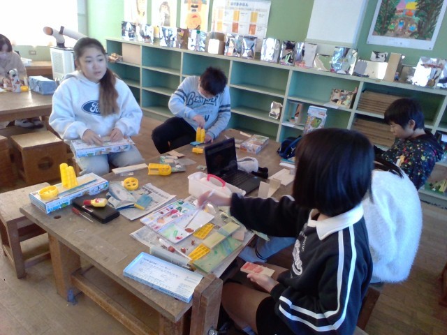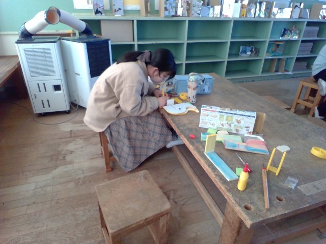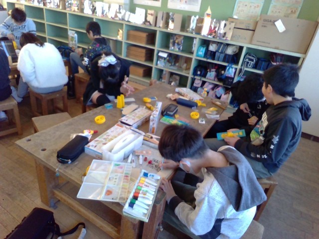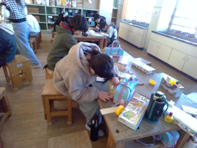 ドライバーでねじを固定する作業や絵の具での色つけを行いました。