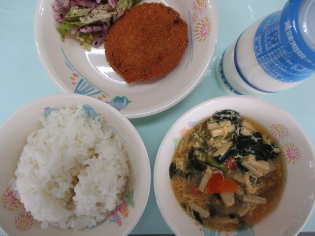 ご飯・牛乳・コロッケ・赤じそ和え・かきたま汁