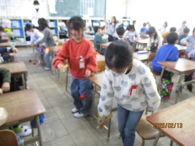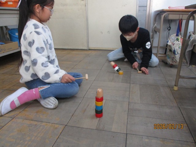今日は、「けん玉」と「だるま落とし」にチャレンジ。けん玉は、うまくできない子がほとんどでした。「だるま落とし」も難しかったようです。でも、「楽しい。」「あと少しでできそうだよ。」「また、やりたい。」と楽しく活動することができました。
