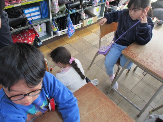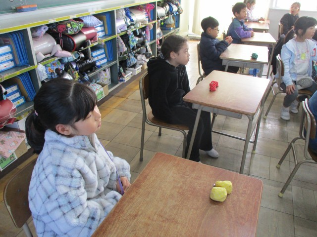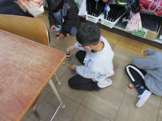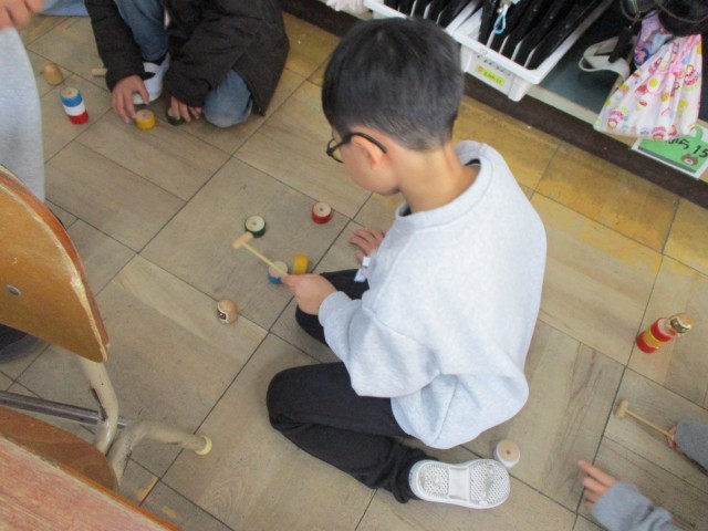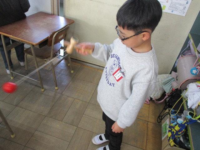 交流クラスに参加しました。先生の話を聞いてから、けん玉・お手玉・達磨落とし・ヨーヨーで遊びました。上手にできたかな?楽しかったね。