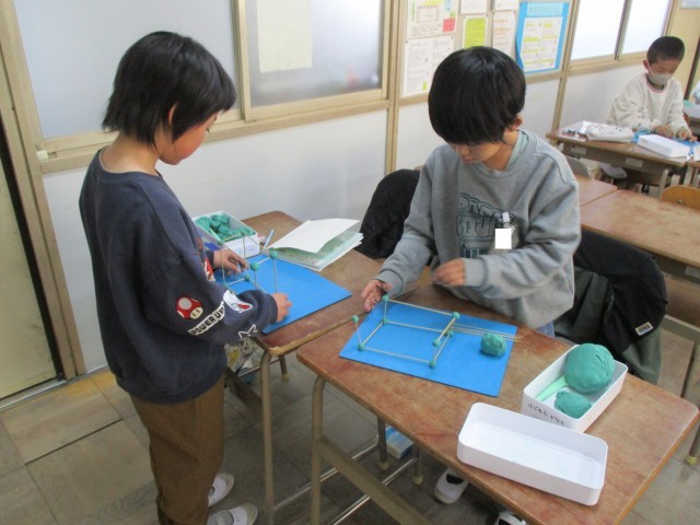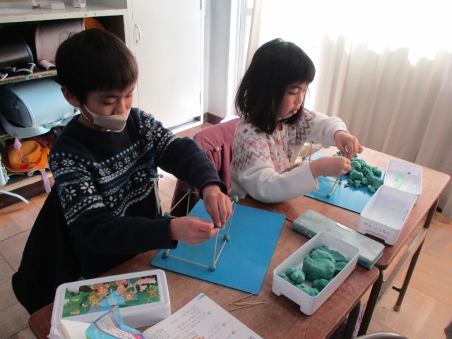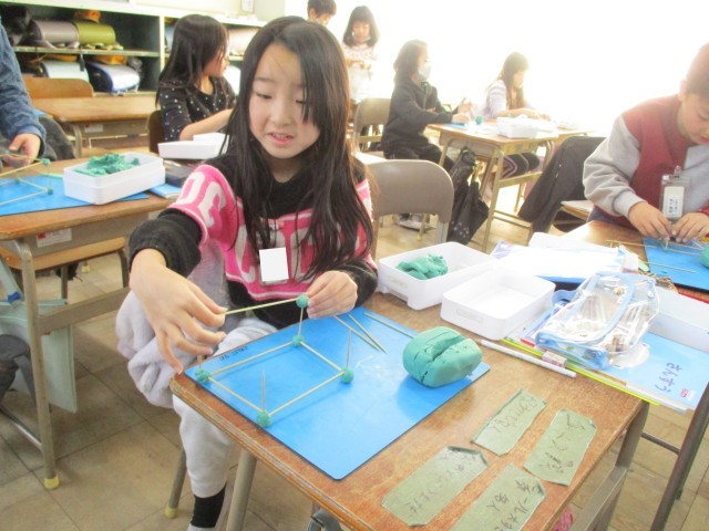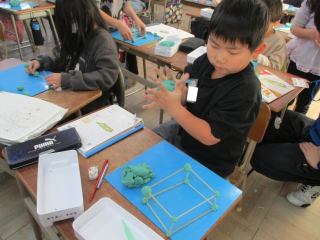 算数の学習で、粘土玉とひごを使ってはこの形を作りました。必要なひごの本数や長さや粘土玉の数を考えて、形を作り上げていました。