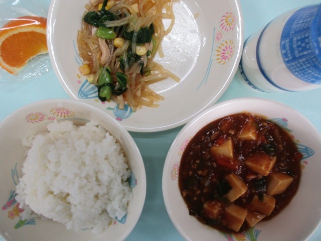 ご飯・牛乳・ヘルシーマーボー豆腐・バンサンスー・清見オレンジ