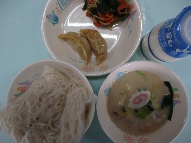 ソフト麺・牛乳・焼きぎょうざ・カラフルナムル・海鮮ちゃんぽん
