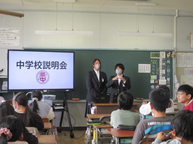 尾西第三中学校の2年生(本校卒業生)が来校し、6年生に向けての出前授業が開催されました。4月からの新しい環境についてみんな興味津々で話を聞き、最後の質問コーナーでは、「部活は何種類ありますか?」「宿題はたくさんありますか?」「中間テストと期末テストってどう違うんですか?」など、たくさんの質問をする姿が見られました。質問に対して中学生の先輩達は優しく丁寧に答えてくれました。6年生にとって4月からの不安が軽減され、ますます期待が膨らんだと思います。