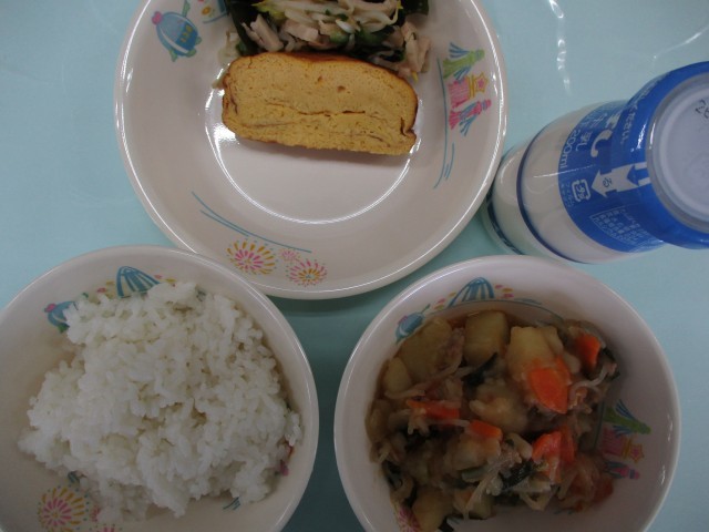 ごはん・牛乳・厚焼きたまご・甘酢和え・スタミナ肉じゃが