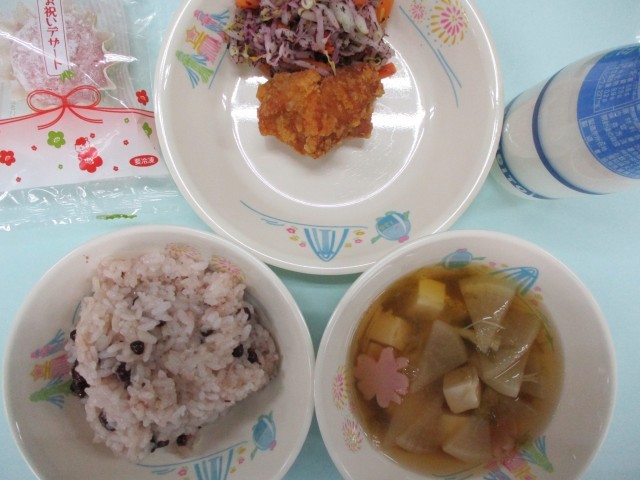 今日は、「卒業祝い献立」です。赤飯は、日本では古くからお祝いの席で食べられてきました。「赤色」は厄除けの意味があり、お祝いには欠かせない色です。赤じそ和えも、お祝いを意識しました。