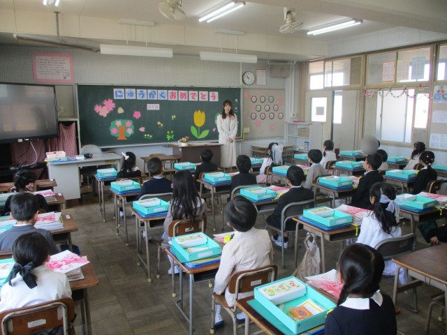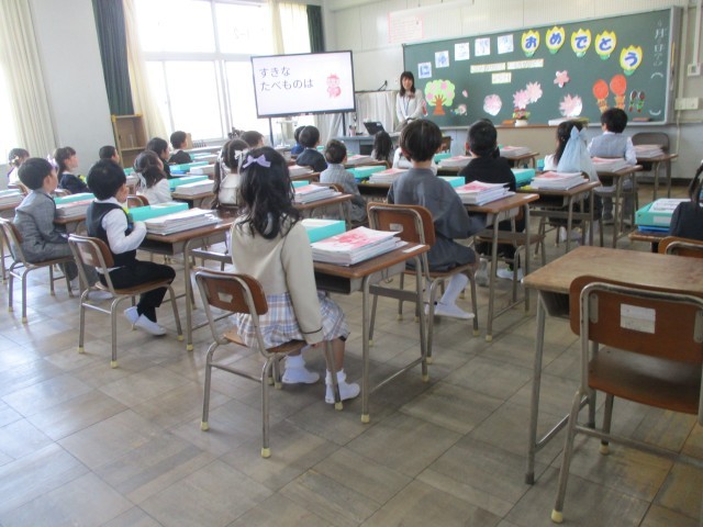 体育館で入学式を行った後、教室へ移動し、学活でクイズなどを行いました。