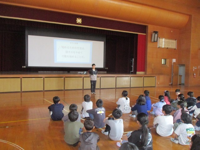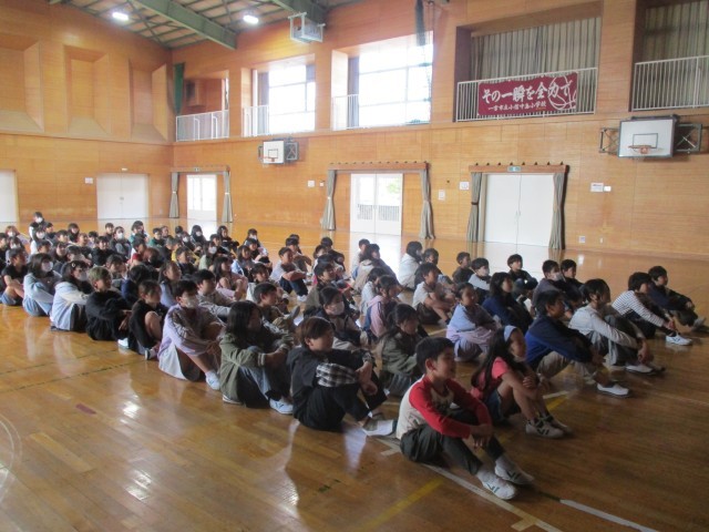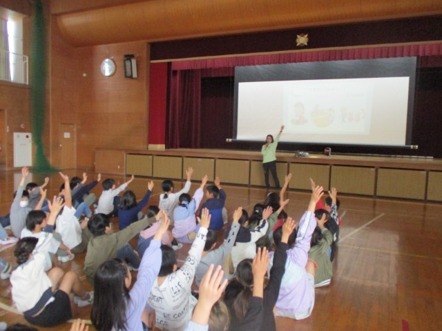 本日、学年集会を行いました。学年で大切にしたいことや学校生活で気を付けることの話を聴いたり、リズムゲームをしたりしました。