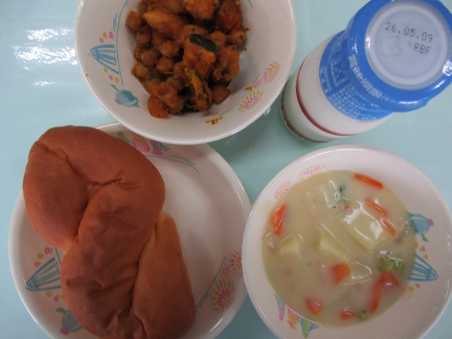 スープは、米粉のホワイトルウを使った優しい味わいの「クリームスープ」です。「スキムミルク」や「牛乳」も入っていて、骨を強くするカルシウムが豊富です。野菜とお肉のうまみが溶け込んだ、栄養満点のスープ、温かいうちにいただきました。