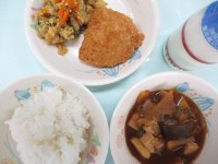 りんごパン・ぎゅうにゅう・パンプキンポタージュ・とうふハンバーグのケチャップソースかけ