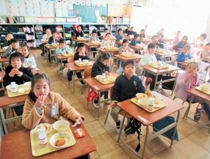 4時間目が終わって給食を食べるのが待ち遠しい子どもたち。今日は、パンにコロッケをはさんでサンドにして食べました。