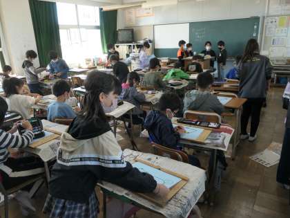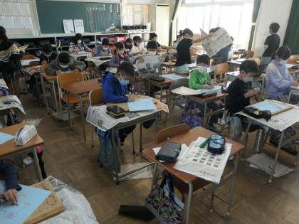 今日の図工の時間は、版画の制作を行いました。まずは、版木に動物の下絵を写しました。できた人から、その下絵の線に沿って三角刀で輪郭を彫っていました。失敗しないように集中して制作をしていました