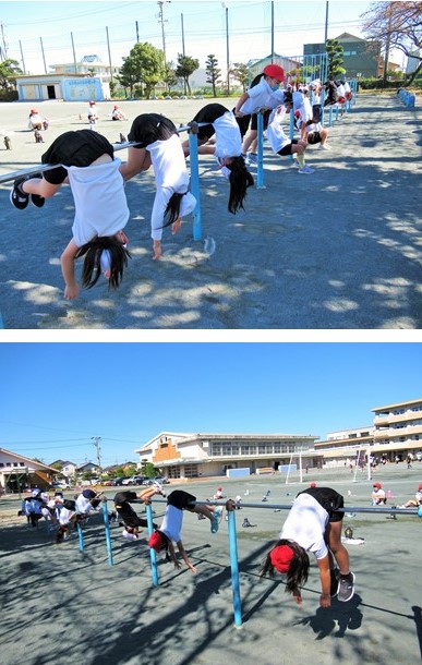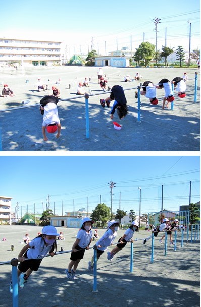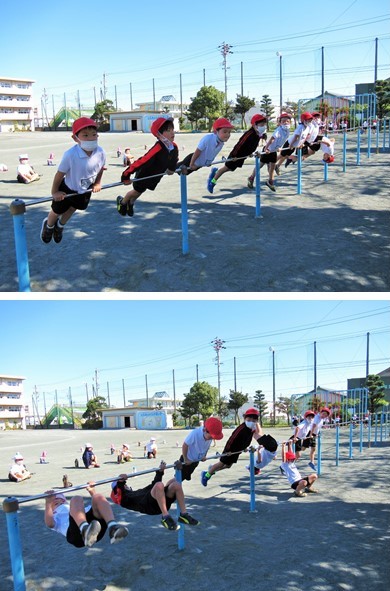 体育の鉄棒あそびの学習で、「ふとんほし」をしました。いつもは、しっかり握っている鉄棒から手を離すのは怖さもありますが、勇気を出して練習していました。