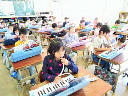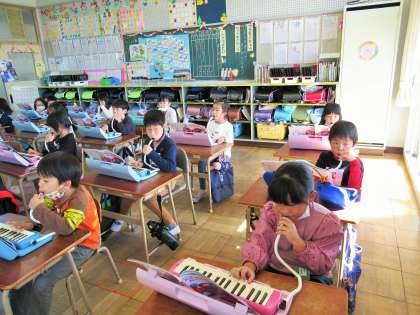 音楽の授業で、けん盤ハーモニカの練習をしました。まだ、「ド」の音だけですが、「トゥー」と息を吐いてタンギングをすることを覚えました。次は、「レ」と「ミ」も使って練習をします。
