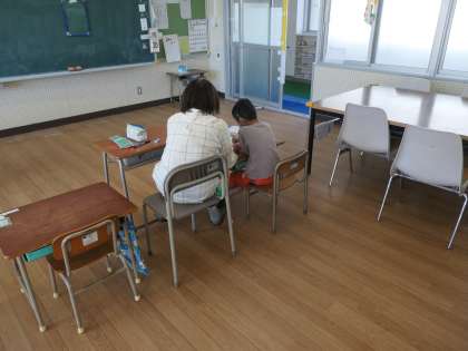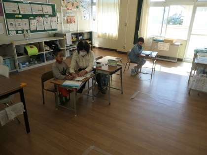 今日の算数の時間は、式と計算の問題プリントに取り組んでいました。先生と一つ一つ確認をしながら答え合わせをしていました。