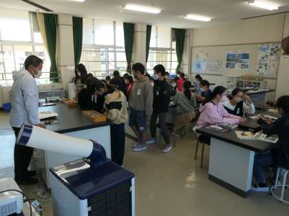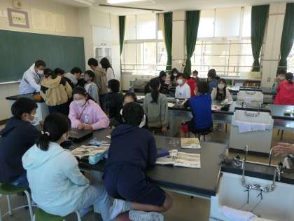 今日は、理科室で地面の縞模様を作っている物の標本を観察しました。礫・砂・どろなどの標本を実際に見て、その特徴を観察をしていました。