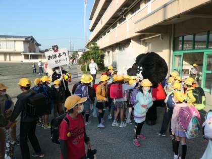 今日は、あいさつ運動最終日です。あいさつ運動にバレーボールチームのウルフドッグス名古屋からマスコットキャラクターの「ウルドくん」と一宮市から「いちみん」が来てあいさつ運動に参加してくれました。今日のあいさつは一段と大きな声でできていました。あいさつ運動は、今日で終わりますが、これからも心のこもったあいさつをつづけていきましょう。