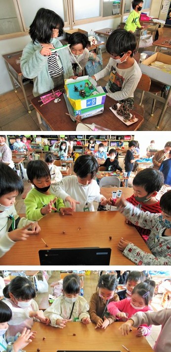 また、どんぐりごまや松ぼっくりのけん玉の対戦もしました。さらに、マラカスで、「おもちゃのチャチャチャ」を演奏しました。