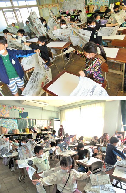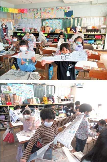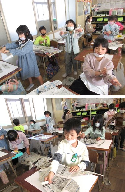 今日の図工の時間は、まず、新聞紙を破りました。そして、やぶいた新聞紙の形を見て、「とりの くちばしみたい!」「ぞうの はなみたい!」と想像をふくらませて、動物を作っていきました。