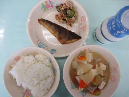 ごはん・牛乳・さといものみそ汁・ほっけの塩焼き・きのこの梅和え