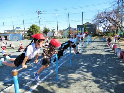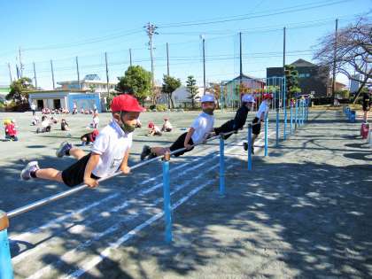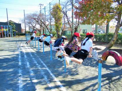 今日で、鉄棒遊びの学習が終わりました。最後の種目は「パラシュート下り」で、鉄棒に上がって、勢いをつけて後ろに跳び下ります。線を引いて、どこまで遠くに跳べたかを楽しみました。