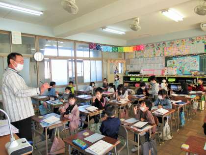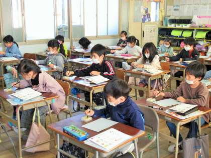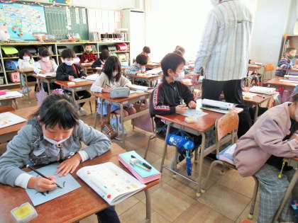先生から筆の持ち方や水のつけ方を教えてもらい、集中して練習していました。「はらい」が上手になると、美しい字が書けるようになります。