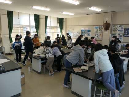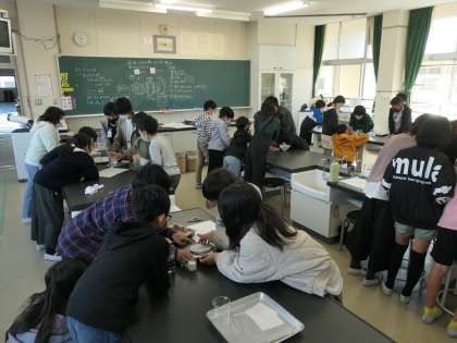 今日の理科の時間は、理科室で実験をしていました。水に物を溶かした後に水の重さがどうなるかを塩や砂糖を溶かして調べていました。